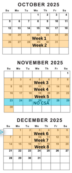 The Fall CSA starts the week of October 20th and continues through the week of December 15th. There will be no CSA the week of Thanksgiving.